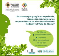 A raíz de la actual problemática sobre la contaminación del aire en Medellín y los demás municipios del Área Metropolitana del Valle de Aburrá, desde de julio (2019) se ha venido desarrollando un nueva versión de Voces Ciudadanas titulada “Por un aire saludable”. Esta gira en torno a la temática de salud ambiental para conocer la opinión de los ciudadanos y escuchar sus percepciones sobre la calidad del aire, los efectos de esta en su salud y demás situaciones que dificultan respirar un aire limpio y saludable.